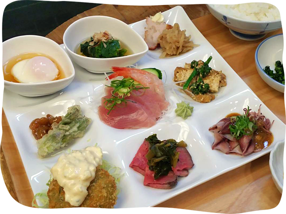 そのときのメニューは、「さしみ定食」、「串カツ定食」、「おでん定食」の3種類。いまも、この定食は人気のメニューとなっております。また、「さしみ、串カツ、おでん」が入っている定食が、いまの「豆狸定食」となっております。さしみに関しては、「なる」、「いか」、「えび」をメインとして、毎日お召しあがりいただいても満足いただける料理をお出しできるように心がけております。