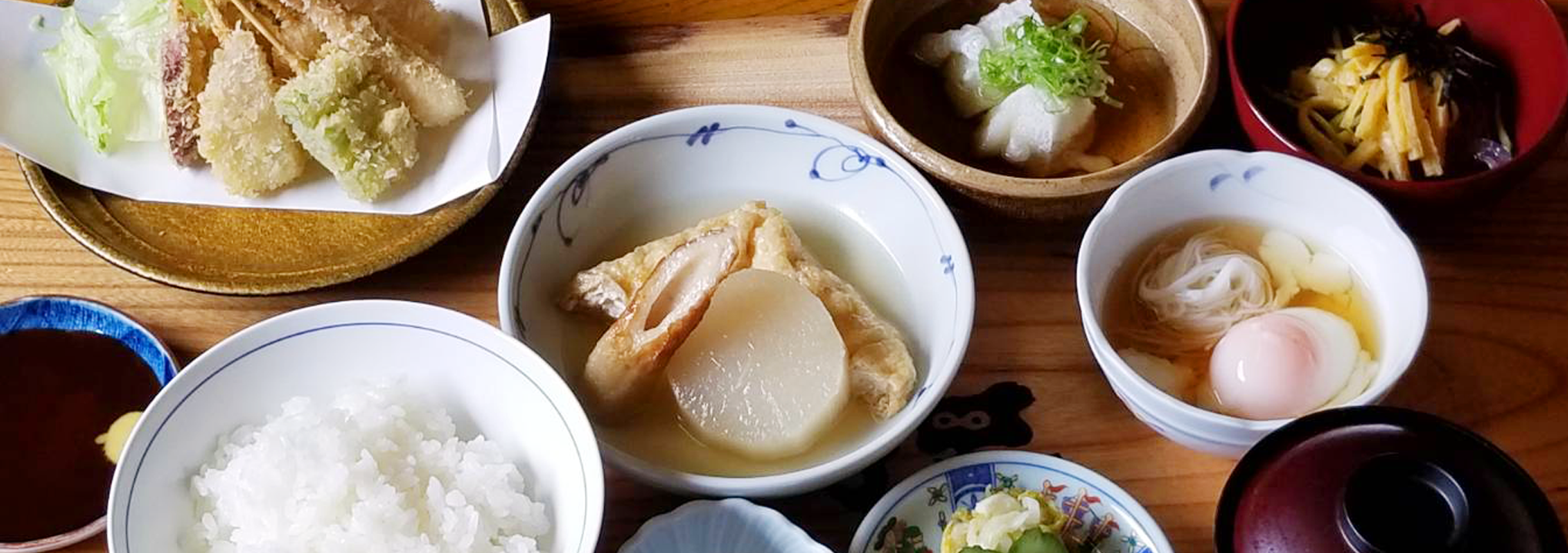 串カツ、魚フライ、揚げ出し豆腐、惣菜各種、炊き込みご飯、茶碗蒸し、コーヒーゼリーのお品となっております。